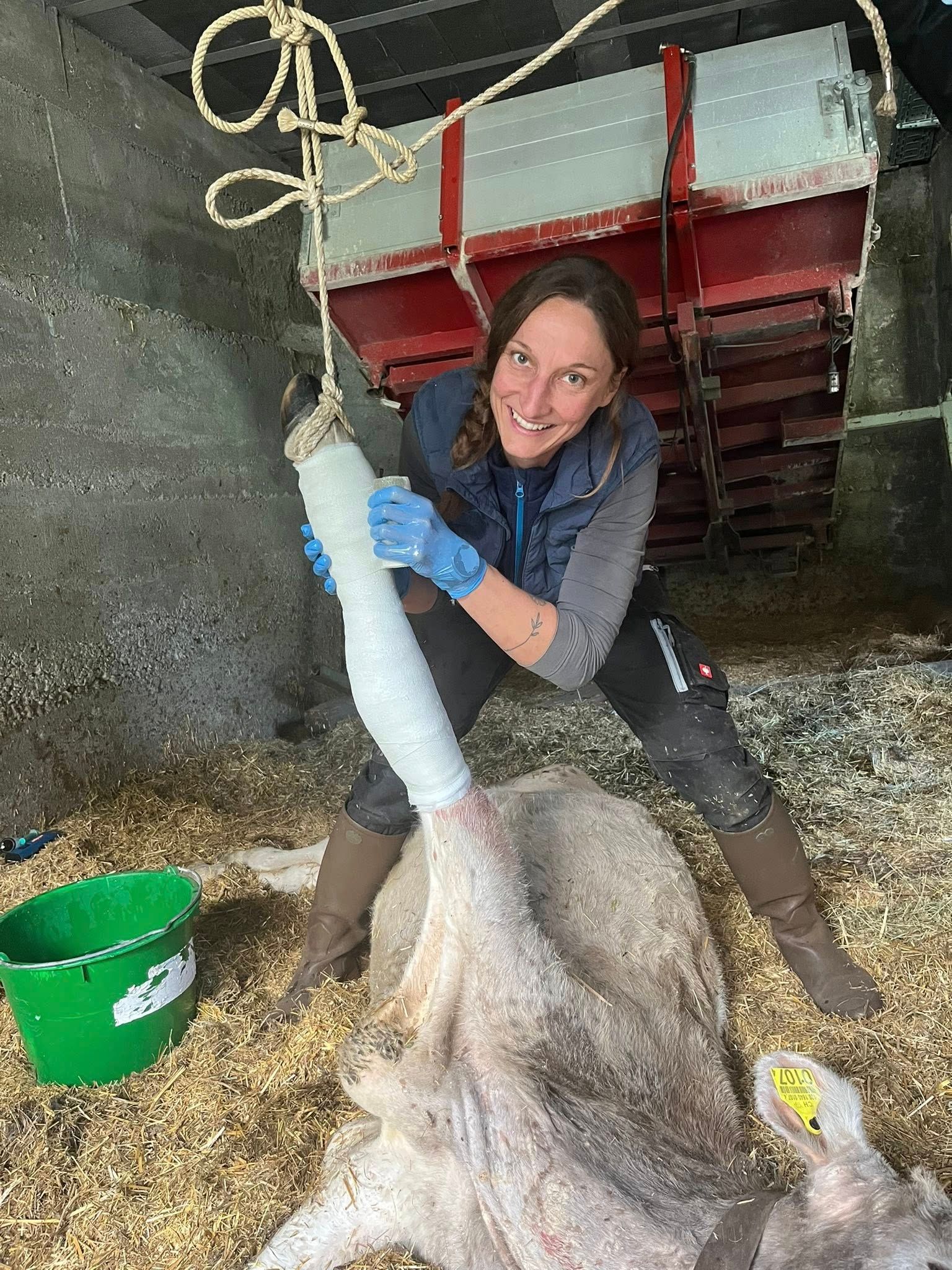 Die Frage, die sich Jenny Graber bei Sissi stellte, war nicht, „soll ich gipsen?“, sondern „wie soll ich die Fraktur reponieren, also wieder in die ursprüngliche Lage bringen“? Das Problem war nämlich, auf beiden Seiten der Fraktur genügend Zug erzeugen zu können. Dafür reichen bei einem 250kg-Tier menschliche Kräfte bei weitem nicht. Wie das Jenny gelöst hat und wie gut die Reposition gelungen ist, erkennst du an den Bildern. Wichtige Anmerkung: Sissi war unter tiefer Narkose. Und dass sie diese gut überstanden hat, siehst du am zweiten Bild.
