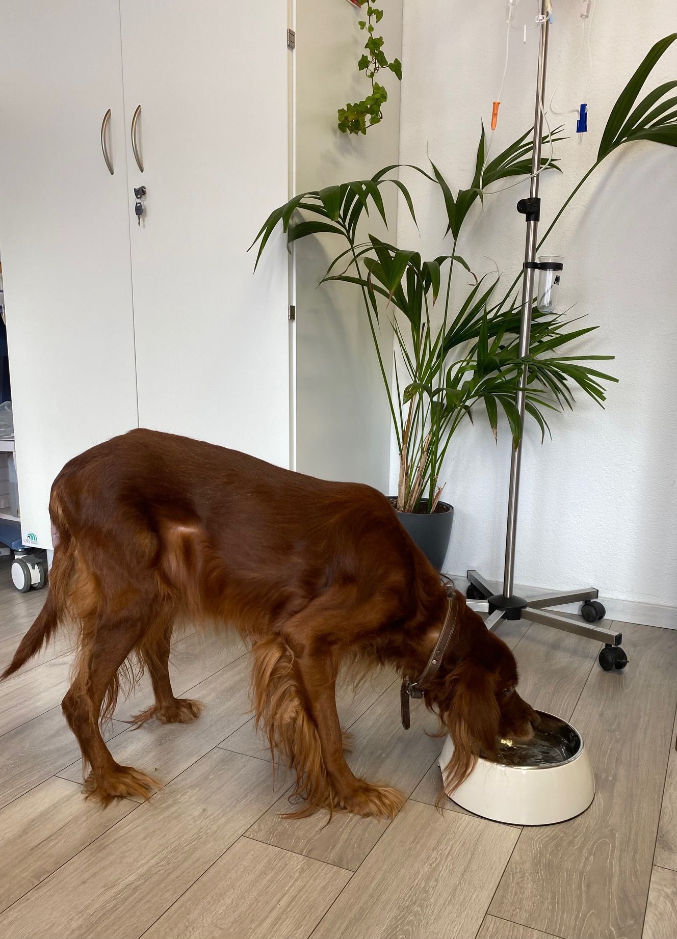 Als Eaton am 12.4.2016 zum ersten Mal bei mir in der Sprechstunde war, konnte ich in der Kniekehle einen steinharten, golfballgrossen, nicht verschieblichen und vor allem sehr schmerzhaften Knoten feststellen. Der Irish Setter belastete das Bein kaum und konnte es auch nicht biegen. Auf dem Röntgenbild konnte man erkennen, dass der Tumor (Osteosarkom) auf Höhe der Wachstumsfuge aus dem Schienbein (Tibia) herausgewachsen war. Die Struktur der Tibia selbst war erstaunlicherweise unauffällig. Auch konnten auf den weiteren Röntgenbildern keine Ableger (Metastasen) festgestellt werden. Dies gab mir Hoffnung bei einem optimalen Operationsverlauf das Bein von Eaton retten zu können. Obschon der Tumor auf einer Fläche von mindestens 3cm vom Schienbein abgesägt werden musste und die Haut für einen direkten Wundverschluss sehr knapp war, verlief die Operation komplikationslos.