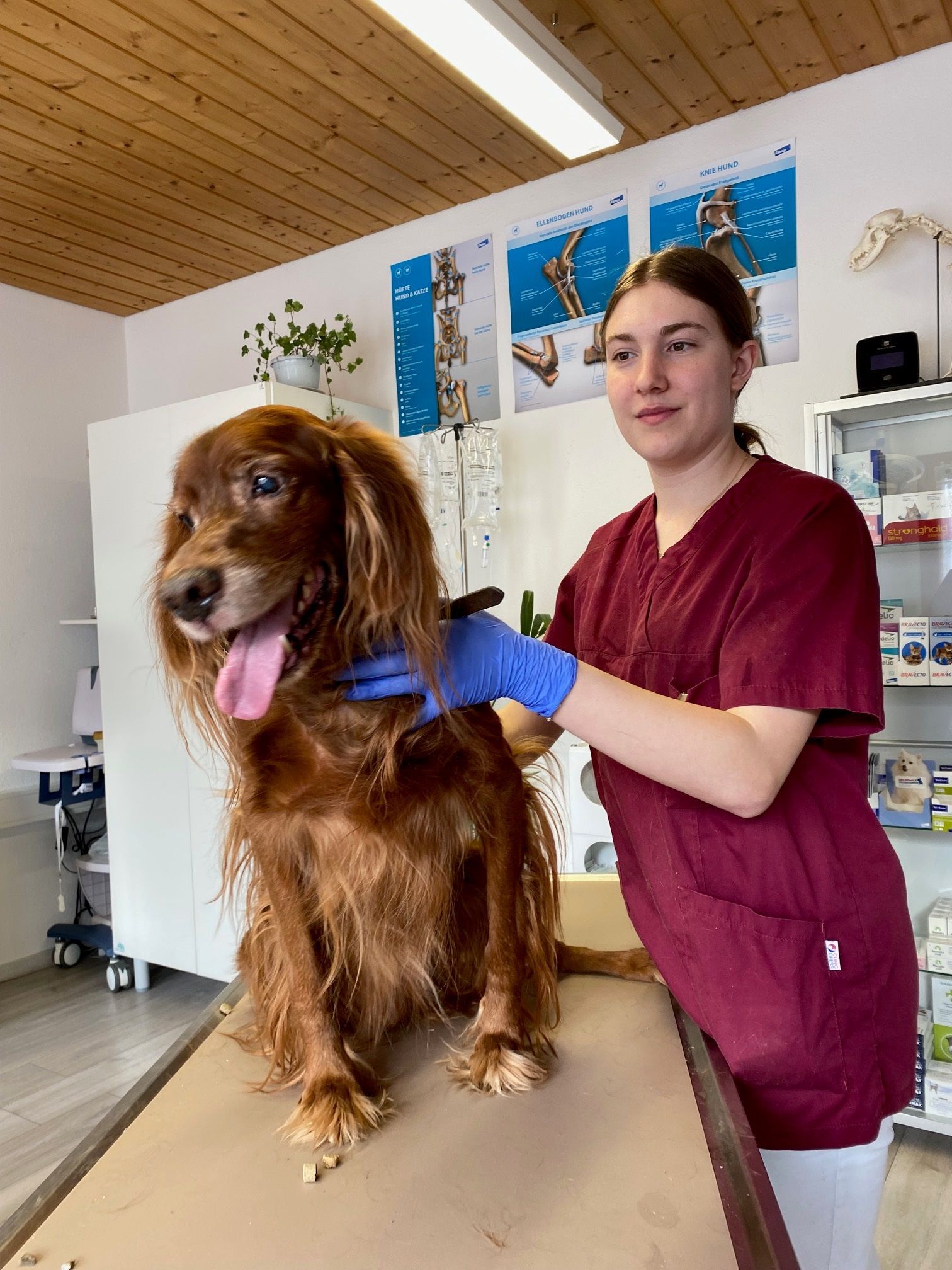 Eines Sonntagmorgens telefonierte ich mit einer renommierten Klinik in Lörrach, weil dort ein bekannter Chirurg tätig war. Leider verreiste dieser aber in den Ferien, sodass ich keinen Termin vereinbaren konnte. Daraufhin ging ich mit Eaton an die Limmat spazieren. Da sehe ich ein Ehepaar mit einem Hund, der das eine Hinterbein eingebunden hatte. Die Dame, die übrigens in Klosters eine Ferienwohnung besitzt, sagte zu ihrem Mann: "Schau dieser Hund (Eaton) hat dasselbe wie unser!" Ich sprach die Frau sofort an. Diese erwiderte, ja wir hatten Probleme und waren deswegen bei Dr, Valär in Klosters, welcher unseren Hund dann operiert hatte. Ihr Mann zückte eine Visitenkarte von ihnen aus der Tasche. Gleich am Montagmorgen habe ich Sie angerufen und für Dienstag den 12.April einen Termin erhalten.